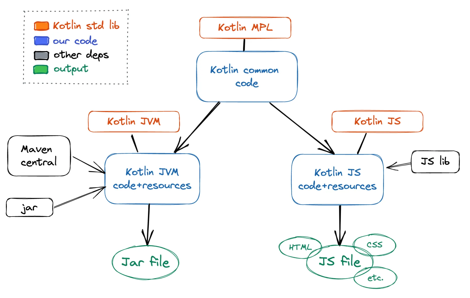 To be executable on different platforms, the common module is written in a way that is independent of the underlying runtime. How is this possible you ask? Because common code uses only a subset of the Kotlin language - the Kotlin Multiplatform Language (Kotlin MPL) - which provides a limited set of APIs and constructs that are guaranteed to be supported by all Kotlin Multiplatform languages.
