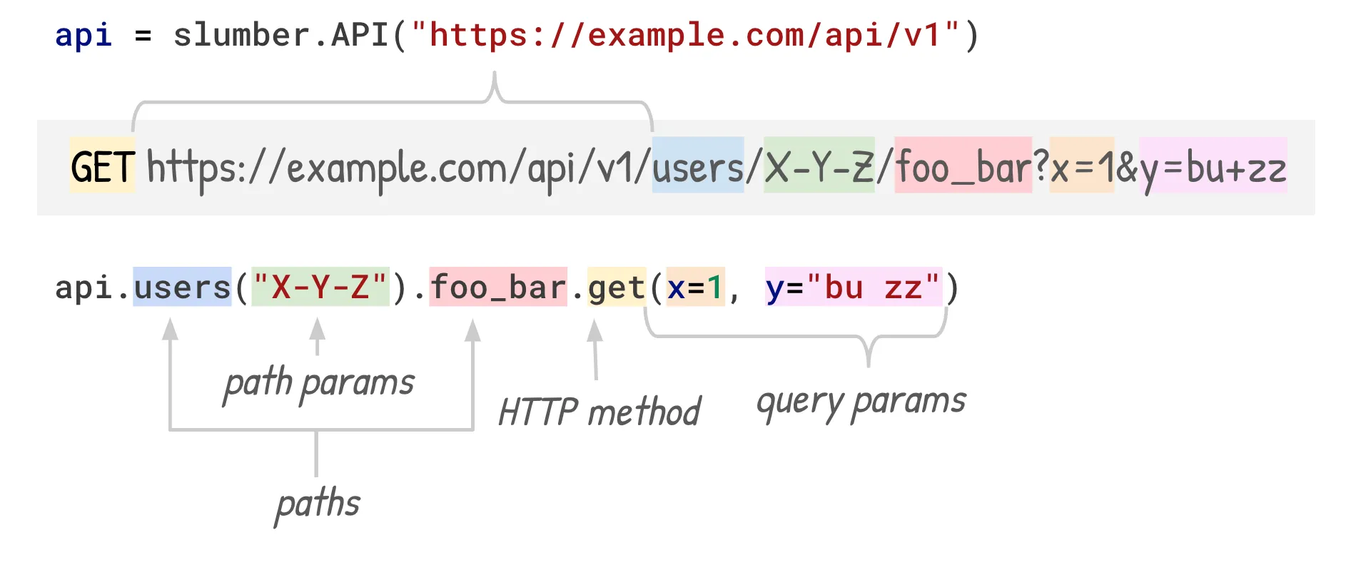 In short, slumber wraps a requests.Session and allows you to use Pythonic constructs to call RESTful APIs. Put even more simply, it translates Python to HTTP calls.